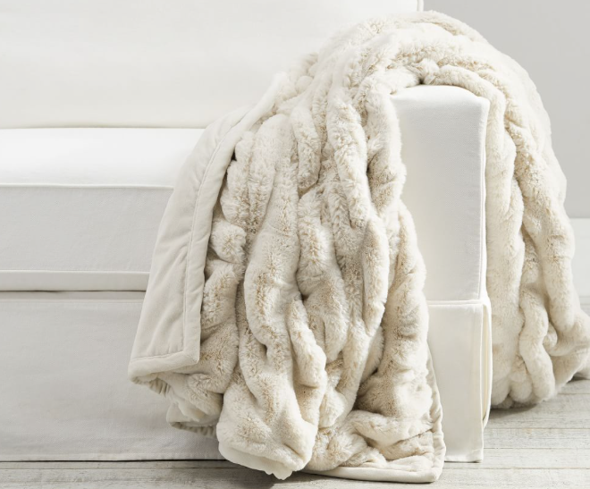 Décor detail: Ivory 50×60” faux fur ruched throws by Pottery Barn (exact here),