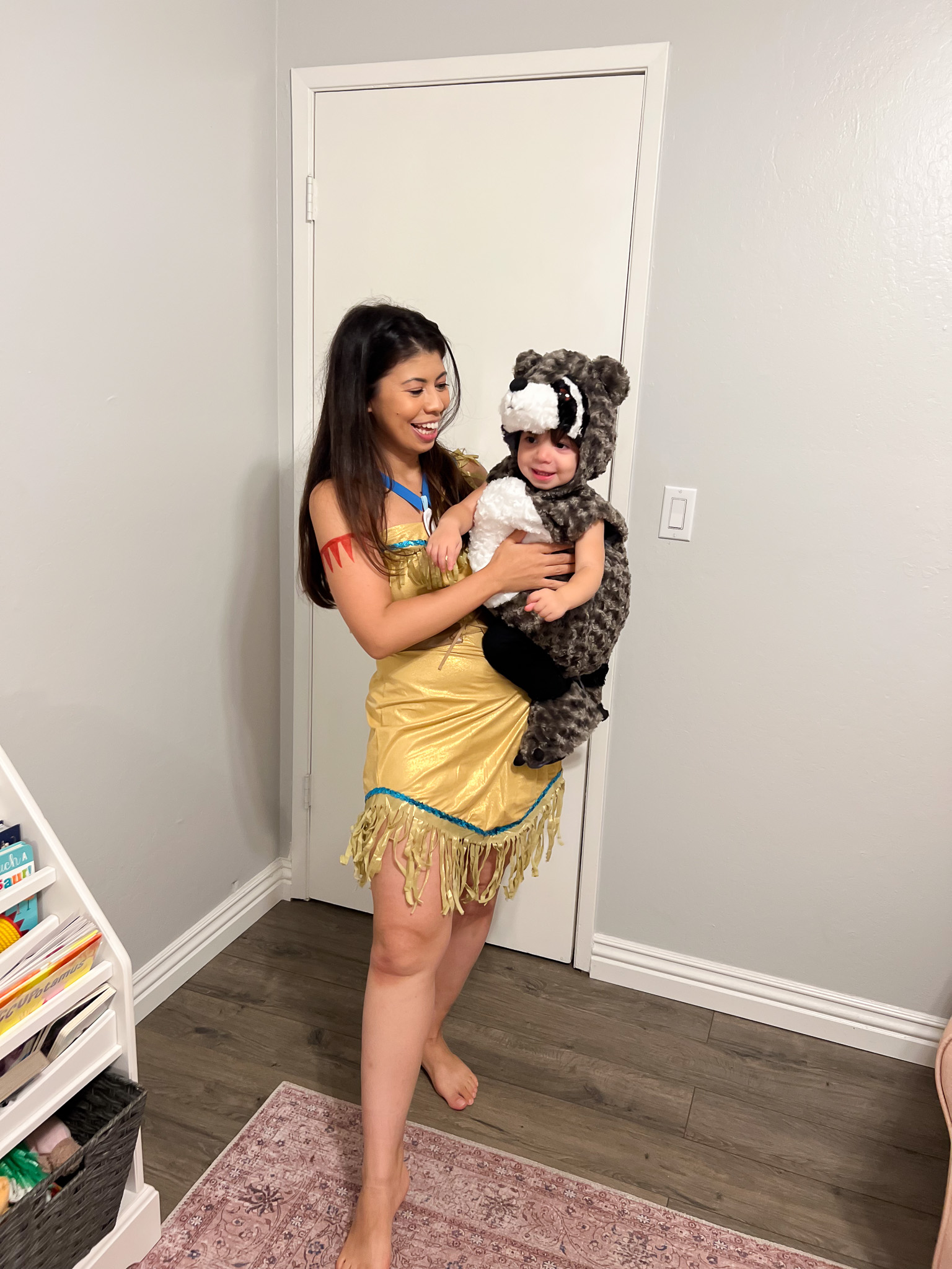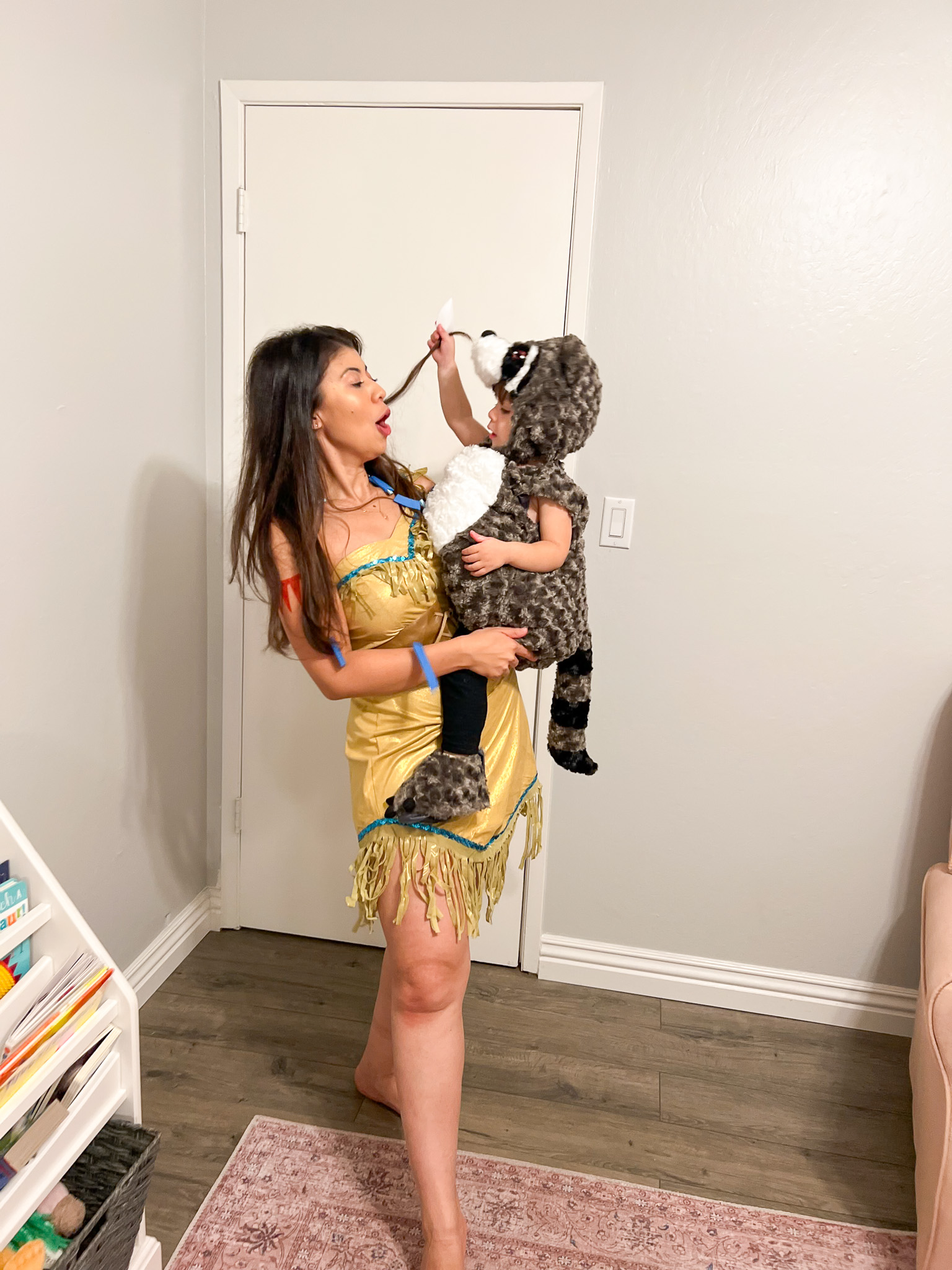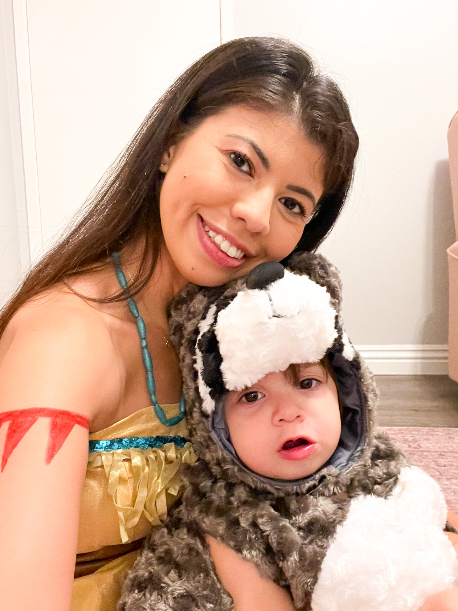 So naturally, I had to dress her as a raccoon. And to make it cute and wholesome, I paired it with a mommy-and-me costume: Pocahontas (me) and Meeko (Katya). I figured I could pull off Pocahontas with my long dark hair, so it felt like the perfect match. I even drew the red arm band details with marker. The costume came with a necklace, but I ordered a bigger, more realistic one too.