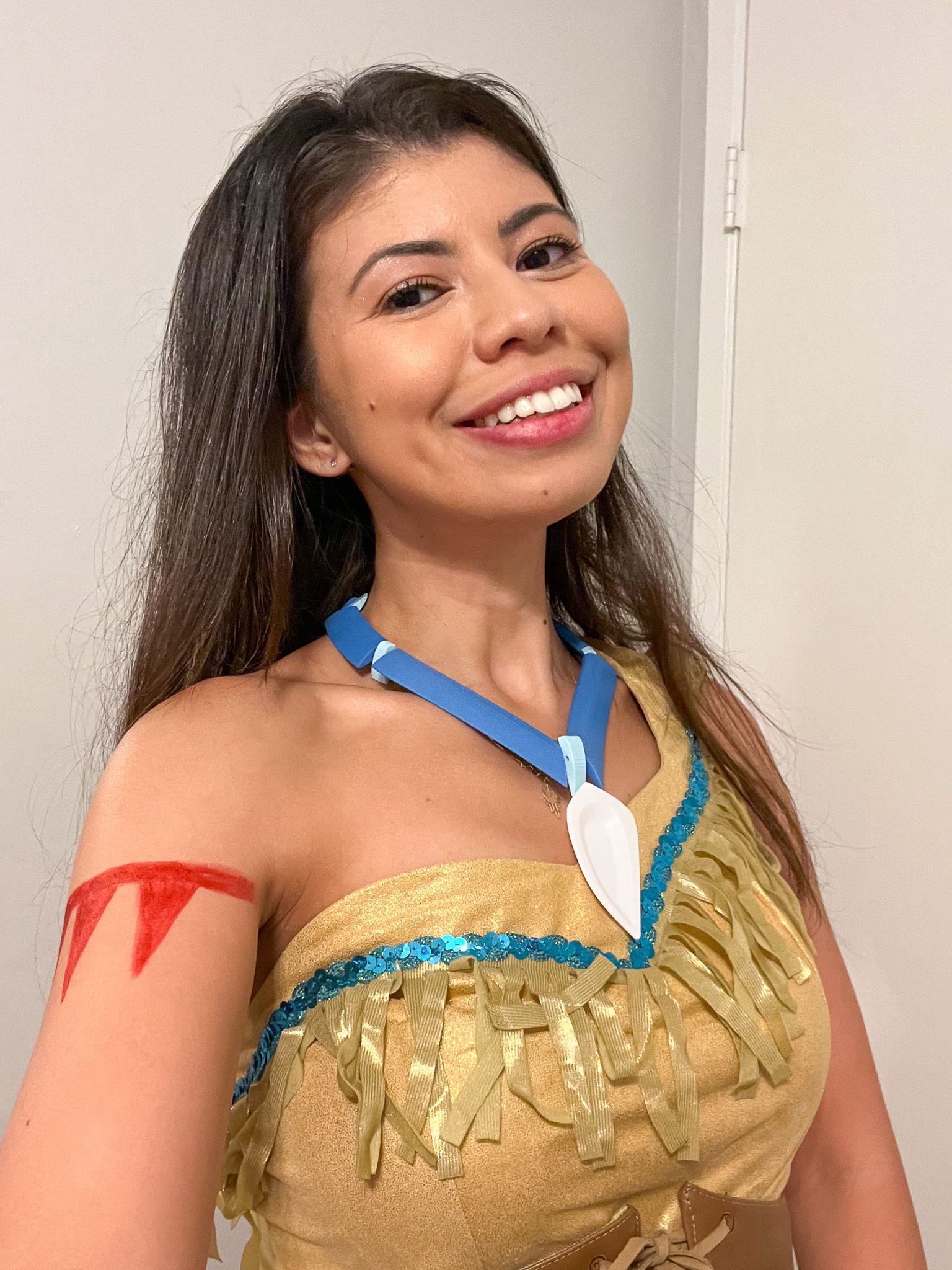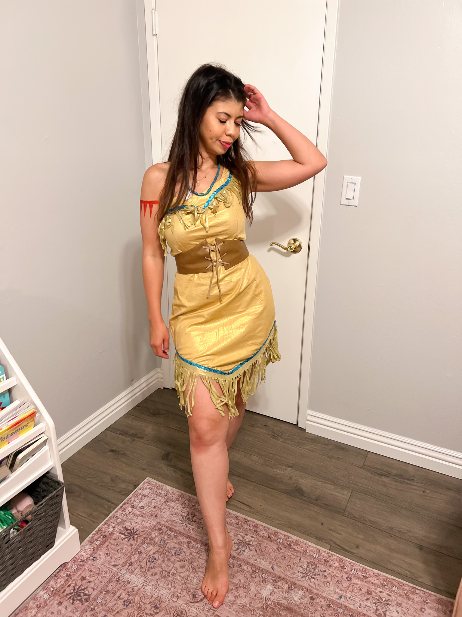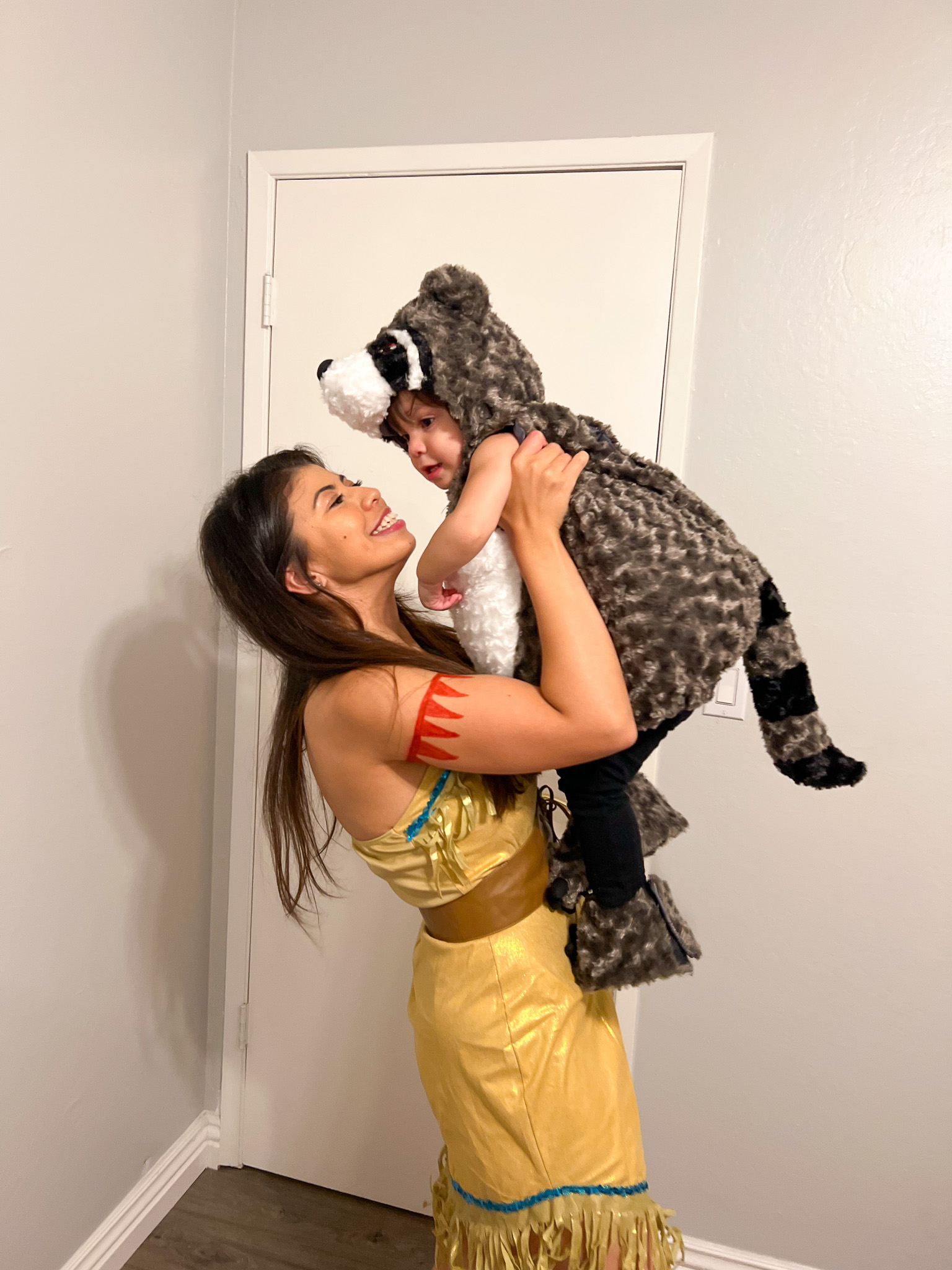 So naturally, I had to dress her as a raccoon. And to make it cute and wholesome, I paired it with a mommy-and-me costume: Pocahontas (me) and Meeko (Katya). I figured I could pull off Pocahontas with my long dark hair, so it felt like the perfect match. I even drew the red arm band details with marker. The costume came with a necklace, but I ordered a bigger, more realistic one too.