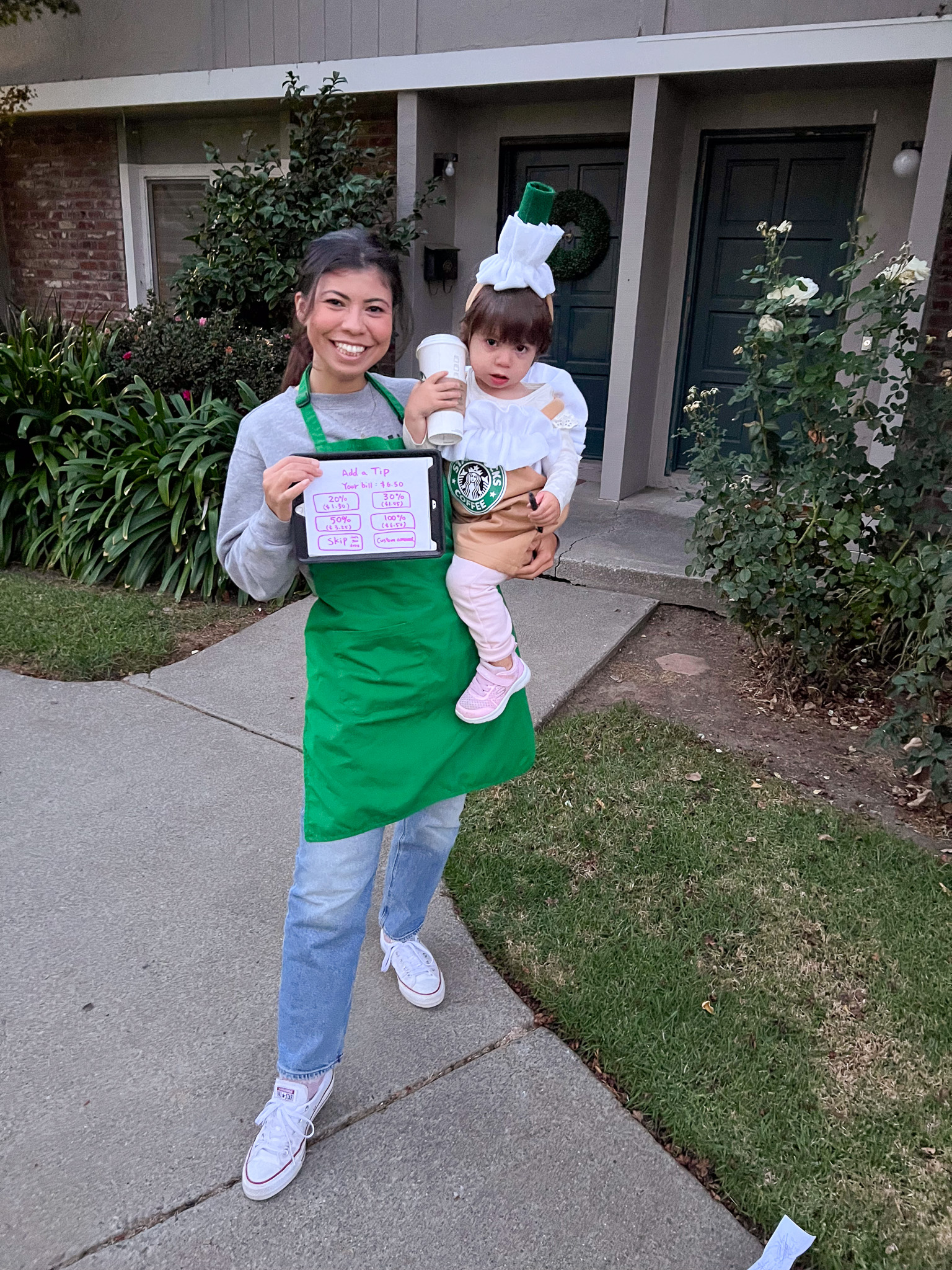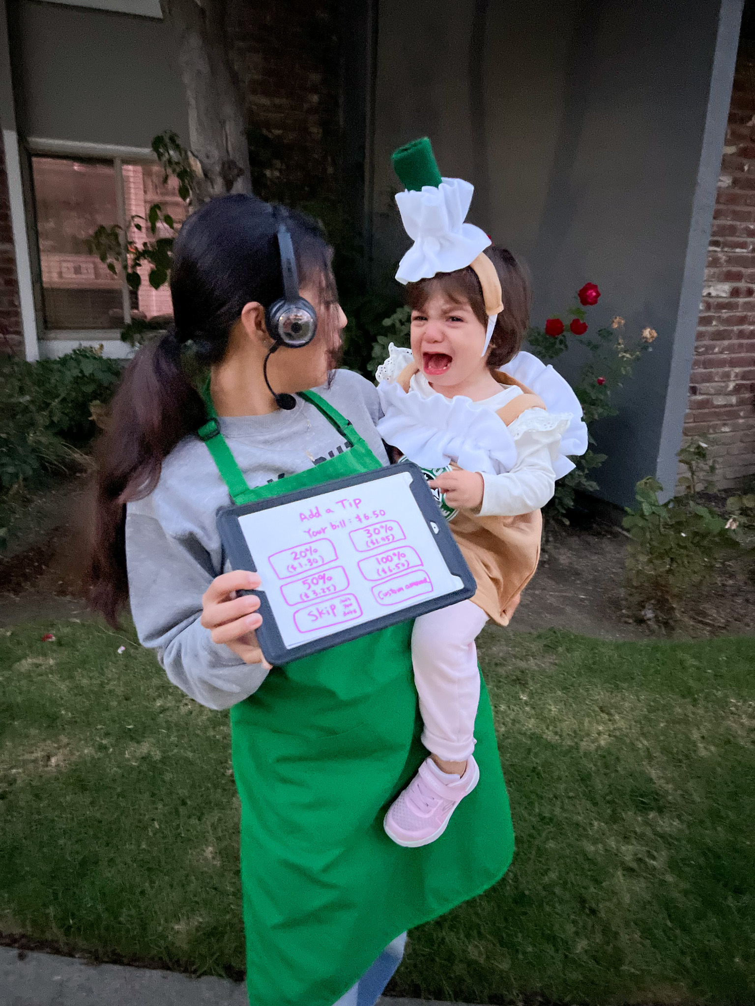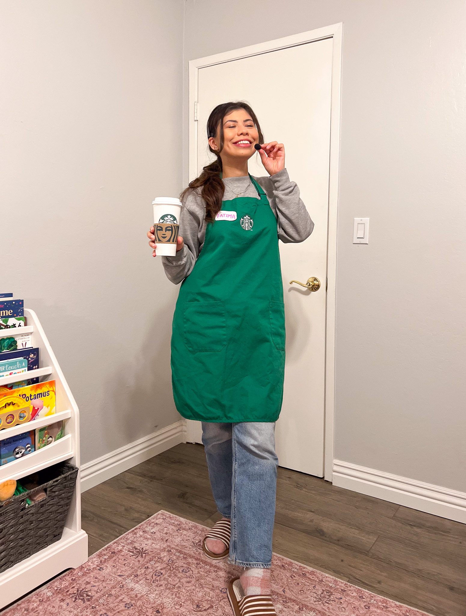 I got my Starbucks apron from a college friend who worked at the campus Starbucks—she knew how obsessed I was (I basically lived off coffee during exams haha). I added a drive-thru headset, made my own name badge, and created a tip screen. Katya’s adorable Frappuccino costume is from Etsy—there are tons of colors to choose from! I’ve also seen people DIY their own version, which can be super creative.