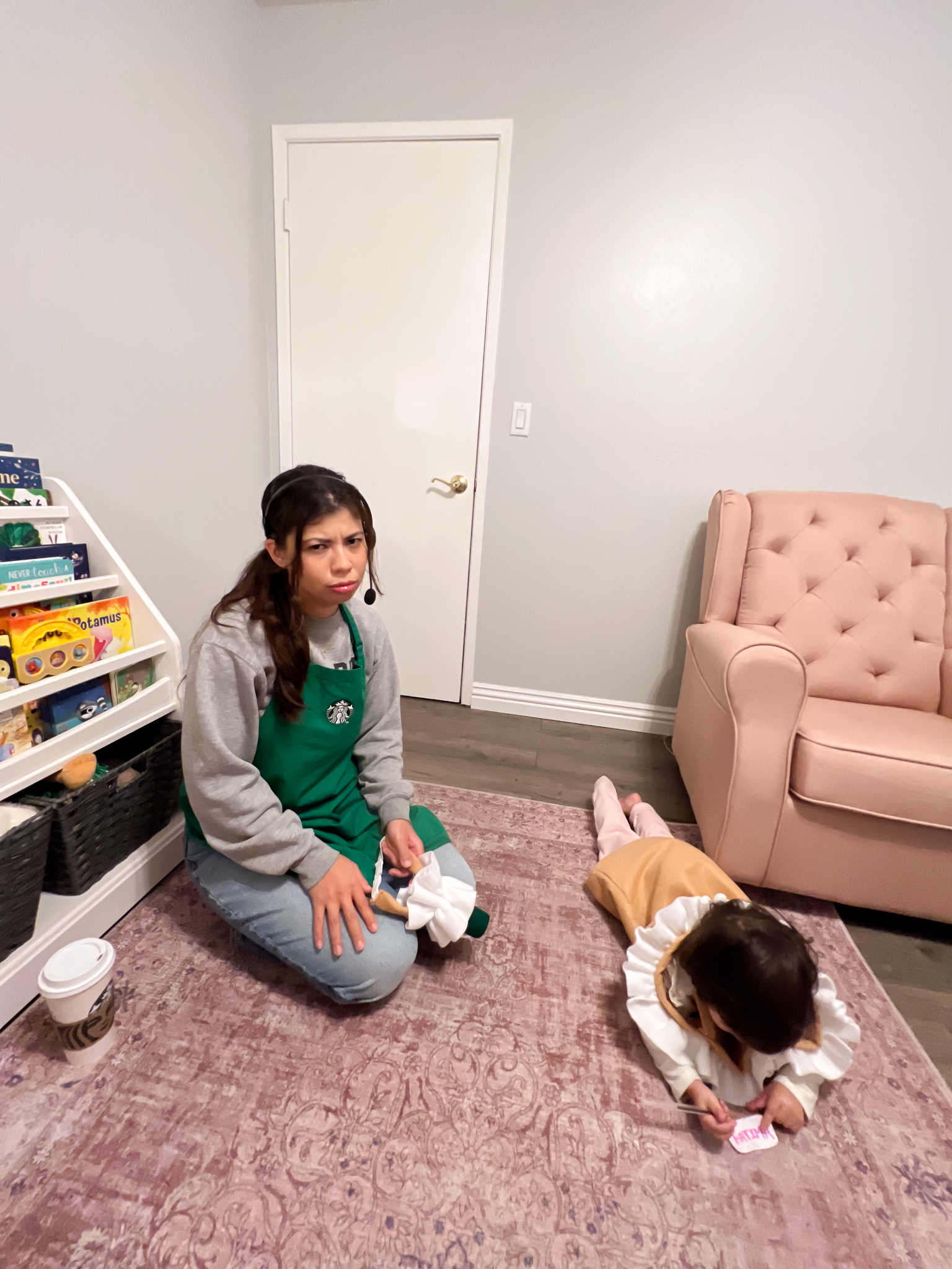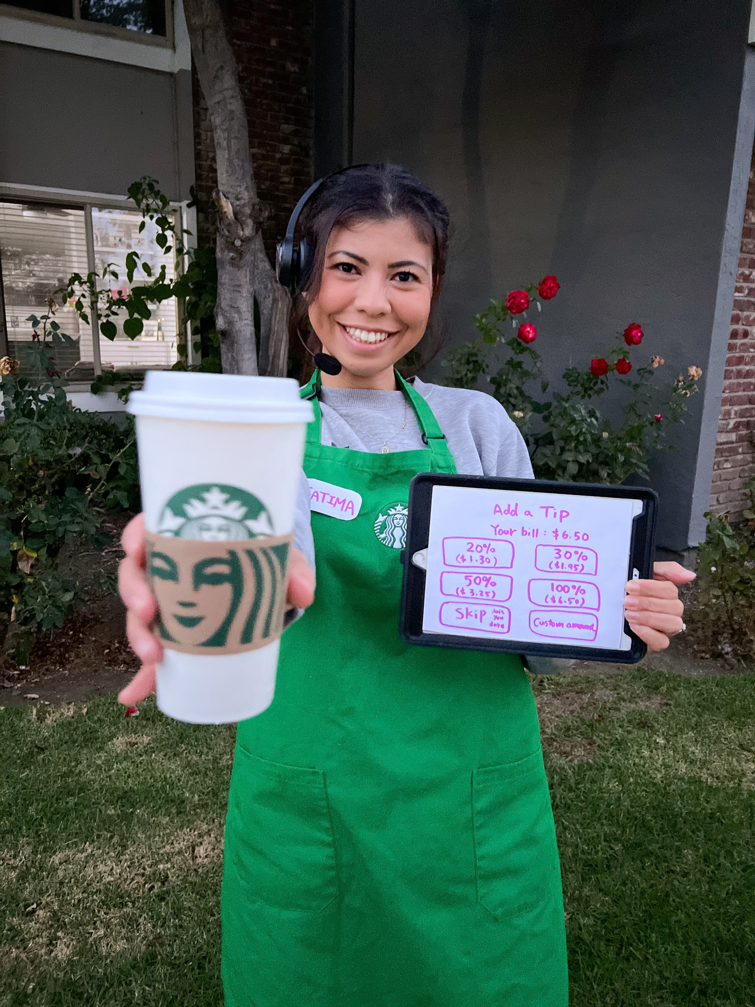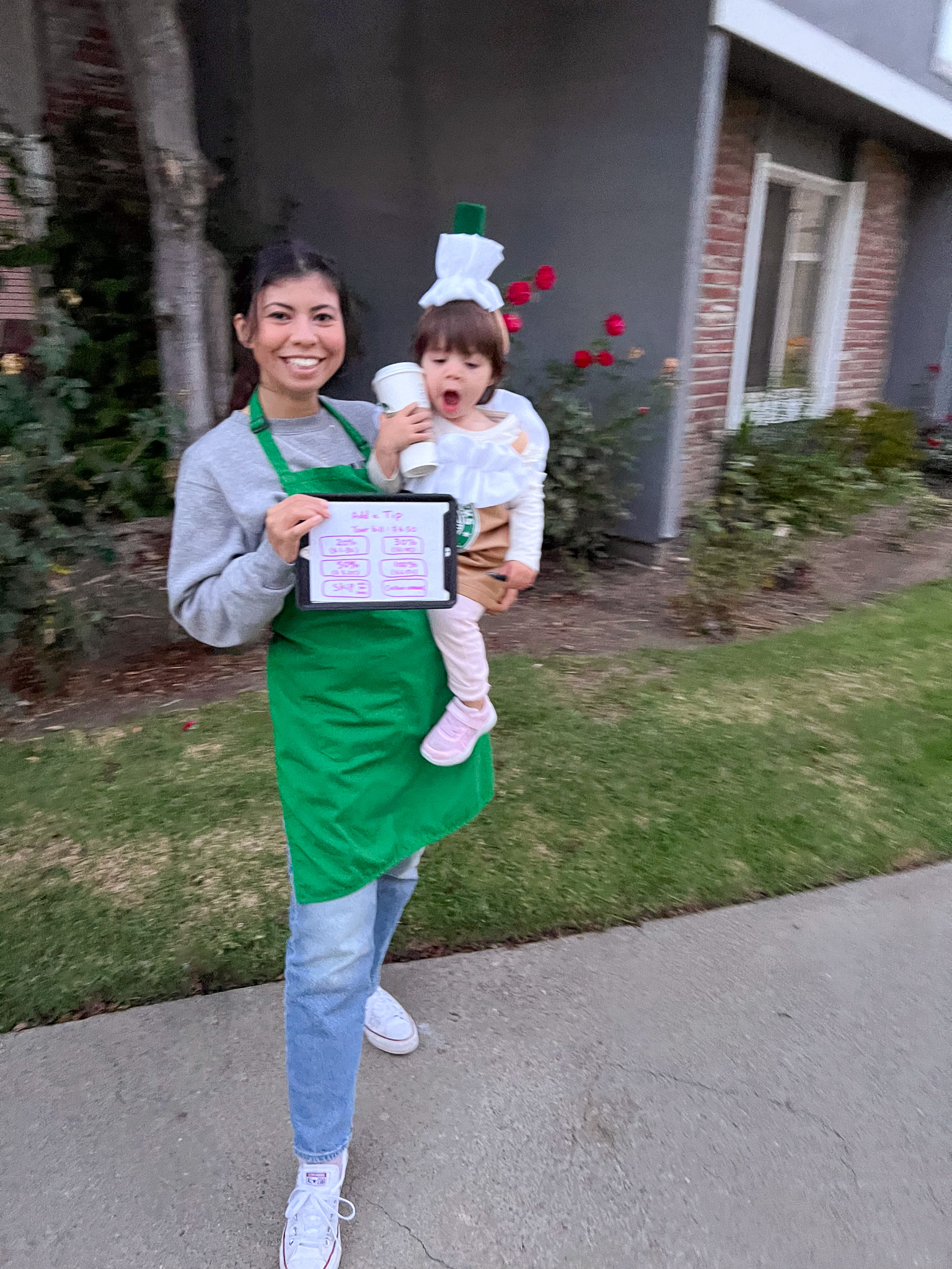 I got my Starbucks apron from a college friend who worked at the campus Starbucks—she knew how obsessed I was (I basically lived off coffee during exams haha). I added a drive-thru headset, made my own name badge, and created a tip screen. Katya’s adorable Frappuccino costume is from Etsy—there are tons of colors to choose from! I’ve also seen people DIY their own version, which can be super creative.