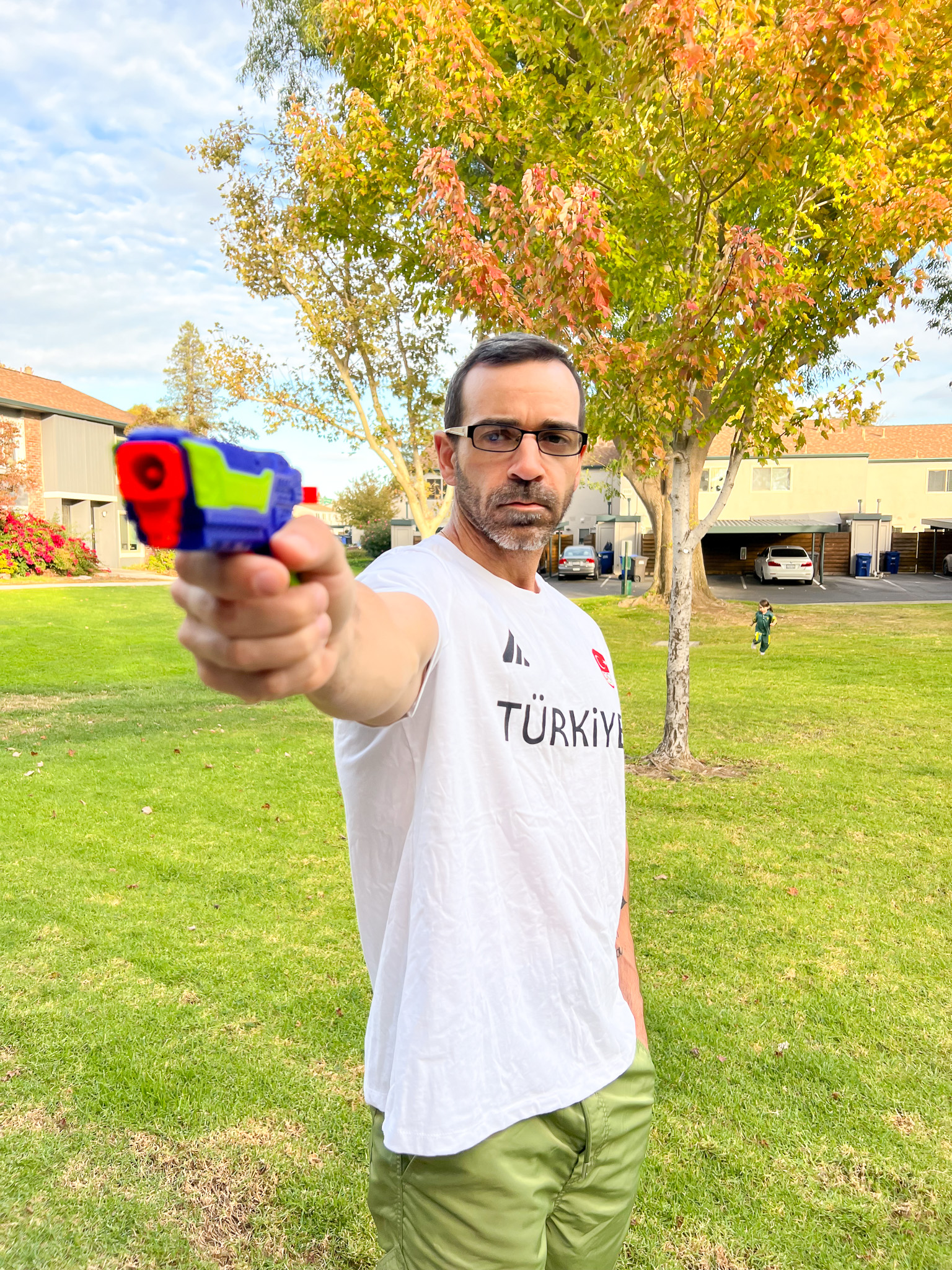 This costume was also perfect for Erik—simple and easy, so he couldn’t say no. I found Turkish Shooting Team–style T-shirts on Amazon, and honestly, the quality was great. You could tell they knew this was going to be a popular Halloween costume this year. I even sprayed Erik’s hair gray, and I was shocked he agreed—apparently, anything gun-related gets a pass lol.