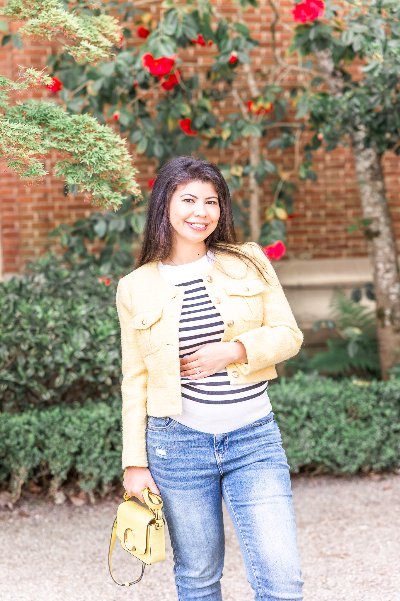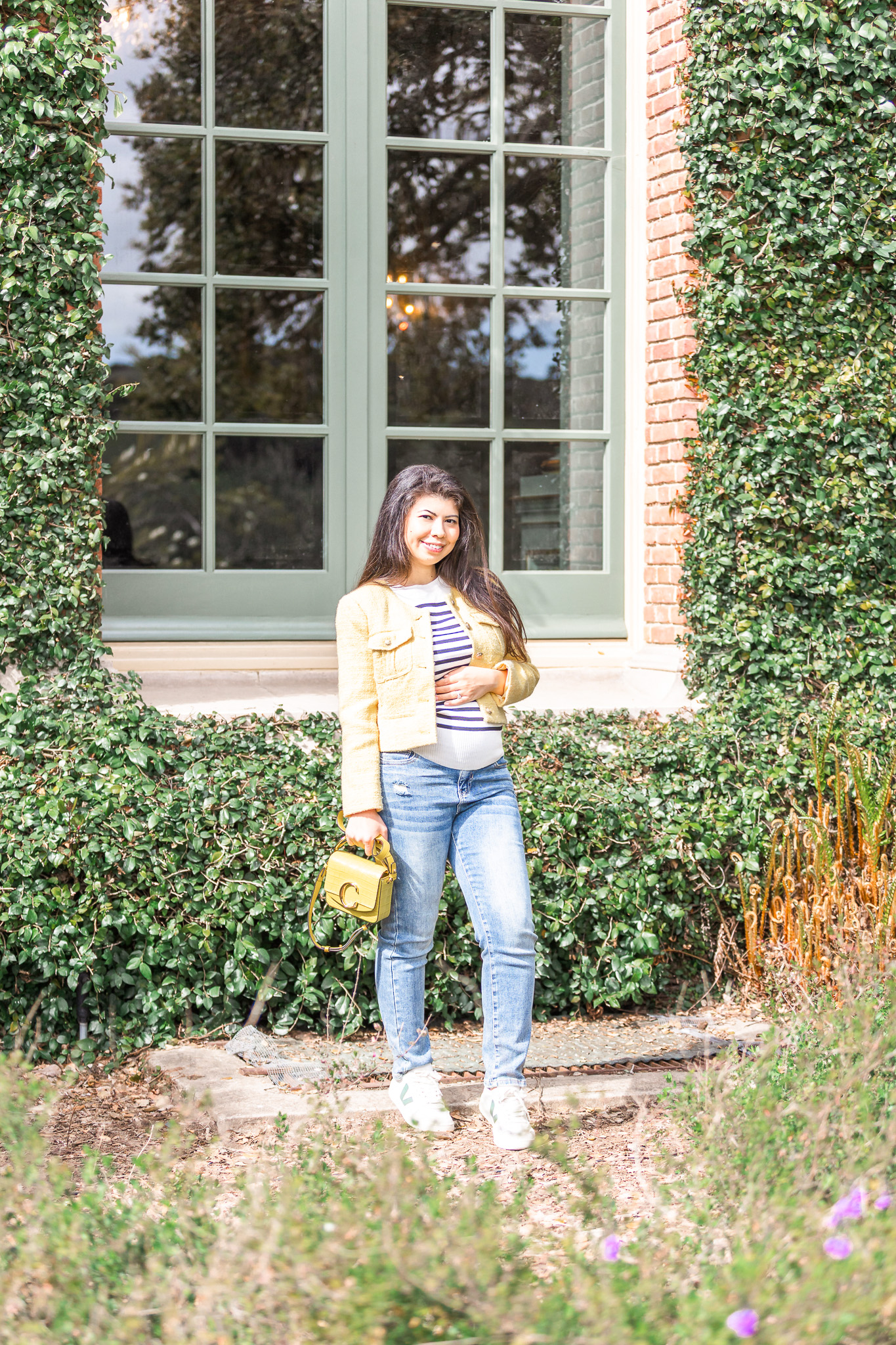 Outfit detail: Yellow blazer by J. Crew (exact here), Navy blue striped knit short sleeve Top by Pinkblush maternity (exact here), Blue distressed maternity skinny jeans by Pinkblush maternity (exact here), Yellow mini C bag by Chloé (pre-loved here), V-90 low top sneakers by Veja (exact here), Gold hoop earrings by J. Crew (similar here).