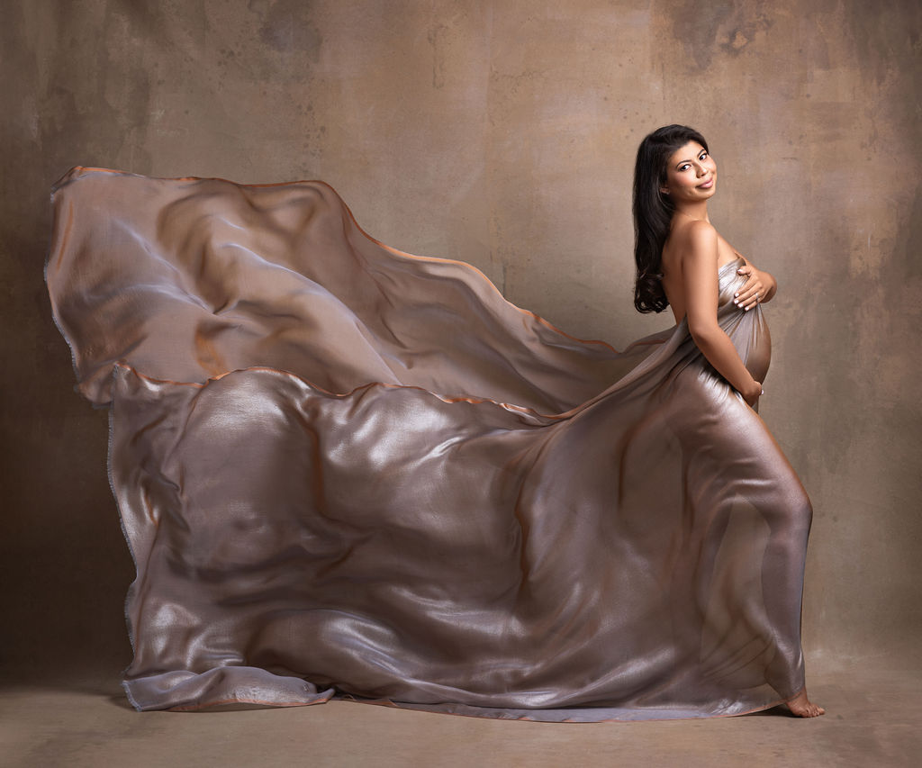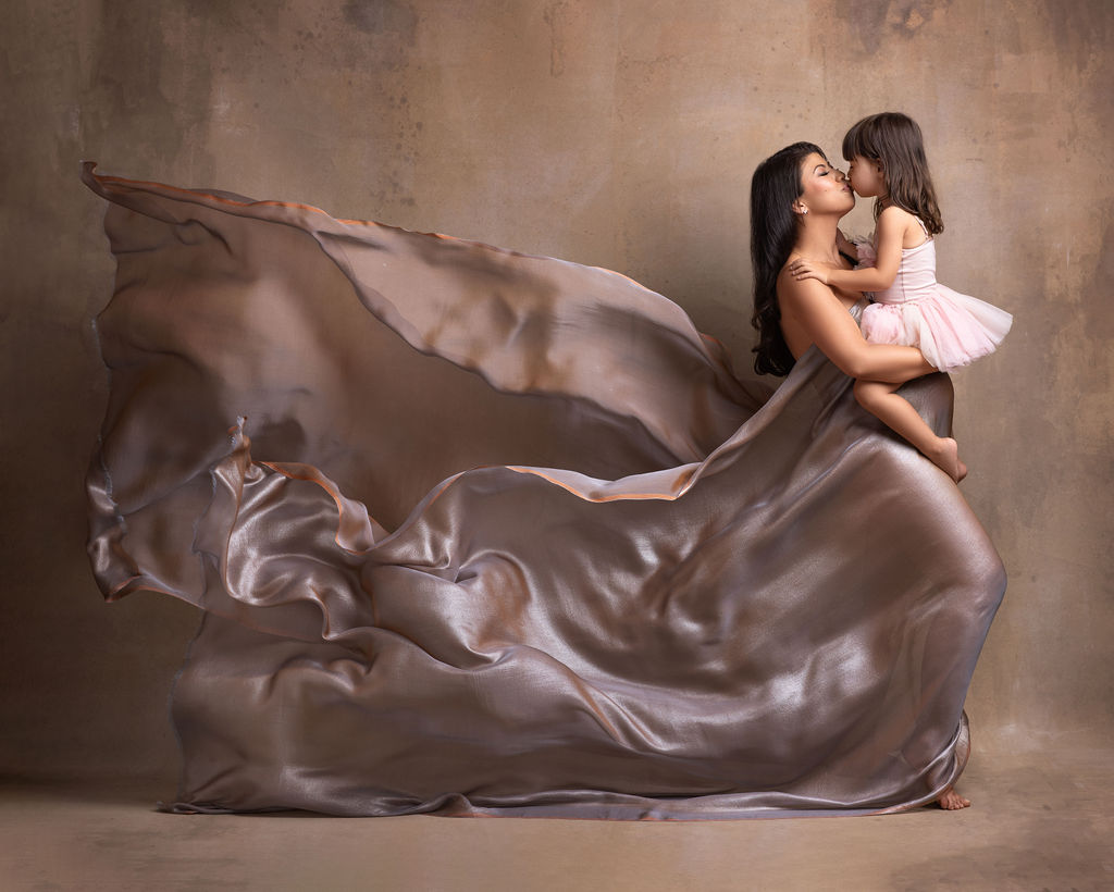 I got to choose 3–5 looks from her studio wardrobe, so I went all the way—from a birthday suit to a full-on glam gown. I stuck to blue and neutral tones to honor our baby boy, and I really wanted Katya in some of the shots, too. Oxana has the cutest luxury kids’ outfits in the studio, and that’s what Katya wore for the flying fabric look. She was absolutely thrilled to wear what she called her “princess” outfits. I also brought a blue outfit for her—the same one she wore in our last Christmas card photo (you can check it out here). The studio had so many gorgeous accessories for both kids and adults—we were seriously like kids in a candy store, haha.