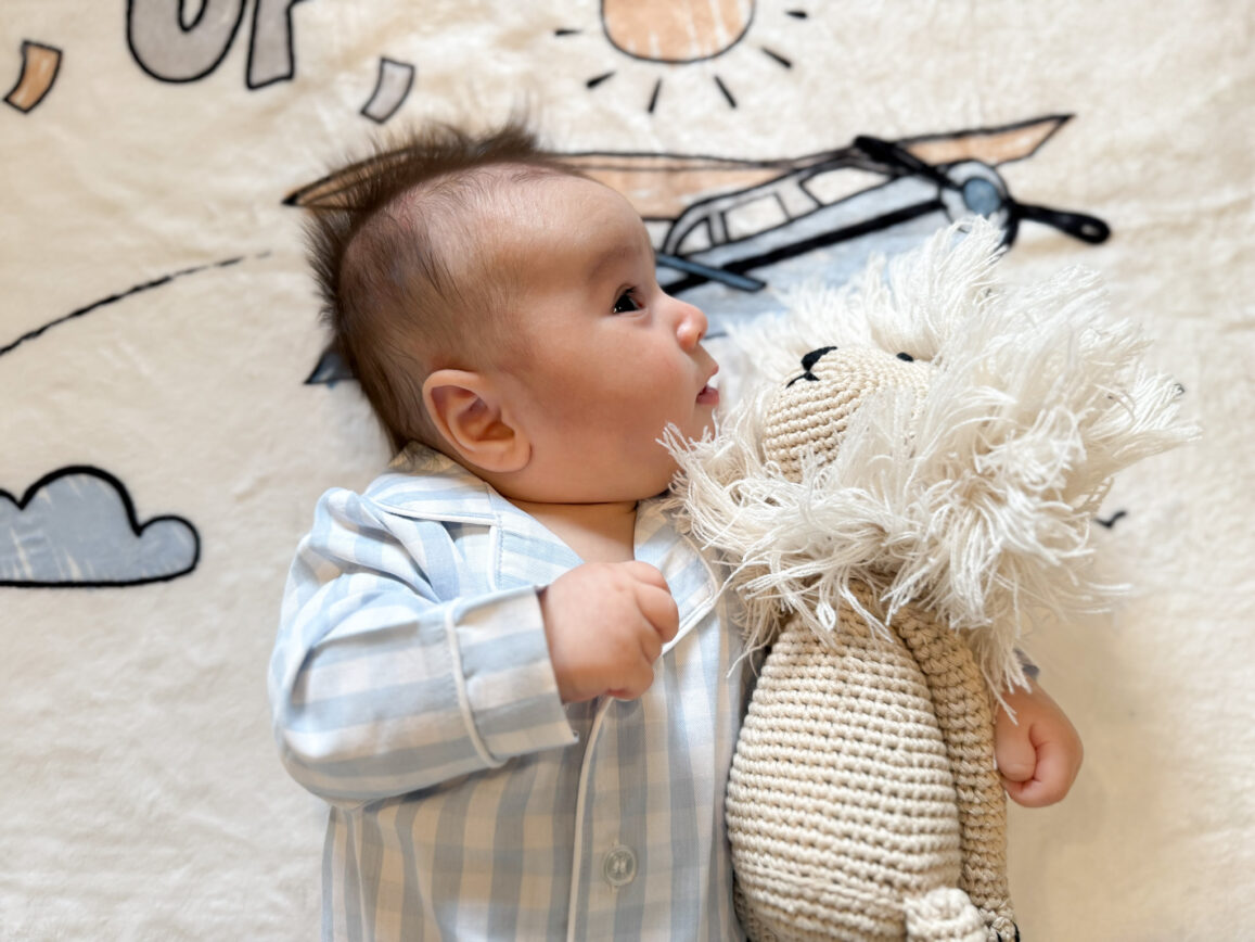 This month was a big one for us—Maverik had a couple of firsts! He had his first giggle with me on October 27th while I was changing his diaper and said something silly. At first, it was one of those “almost there” giggles, and I thought, Did I really just hear that? So I kept making silly faces and noises, each one bigger than the last—and then he finally giggled! Aww, it completely melted my heart. I immediately told Erik that he giggled, but he was in denial because he wasn’t the first to hear it lol. It’s not a competition, Erik!