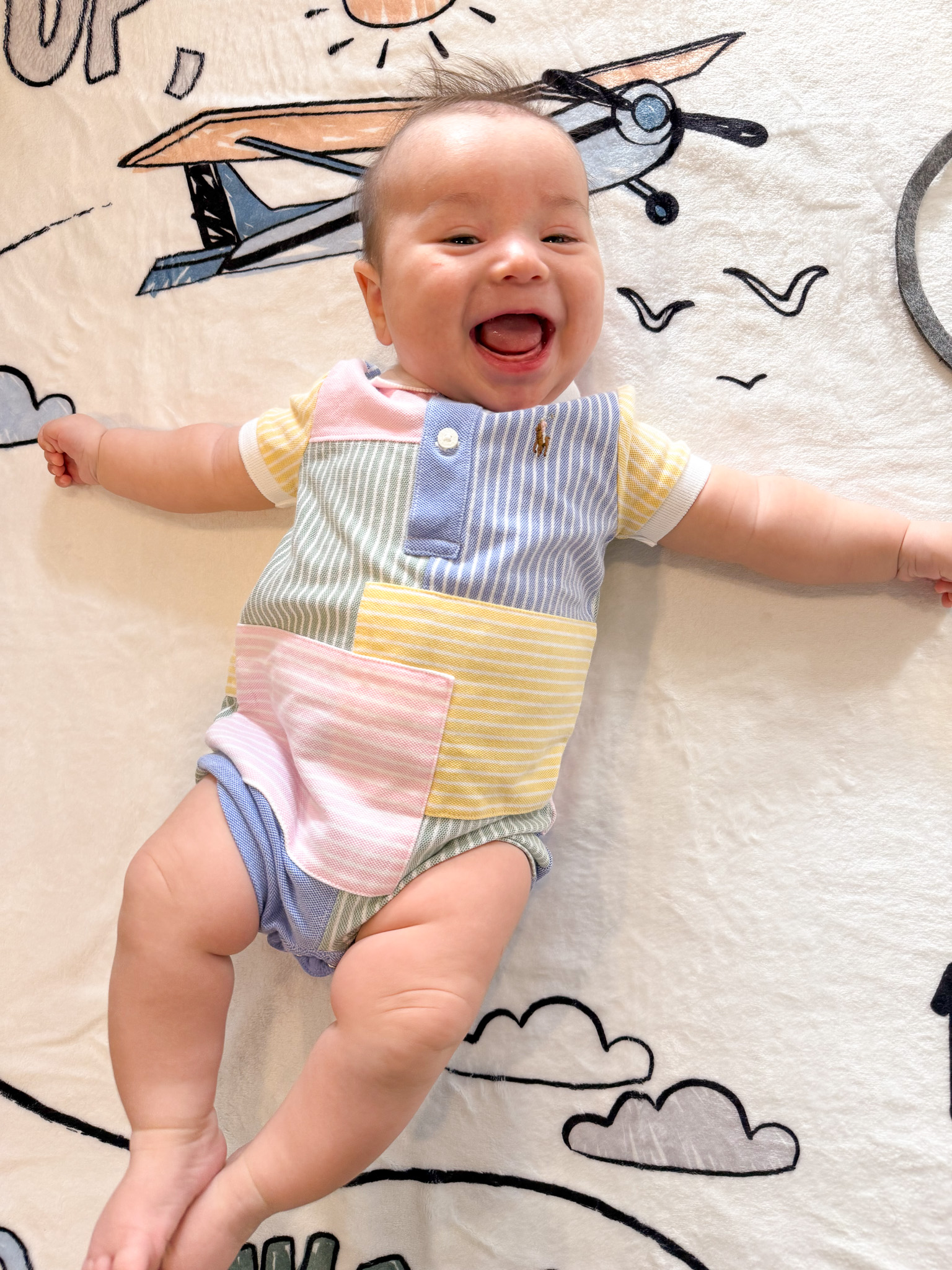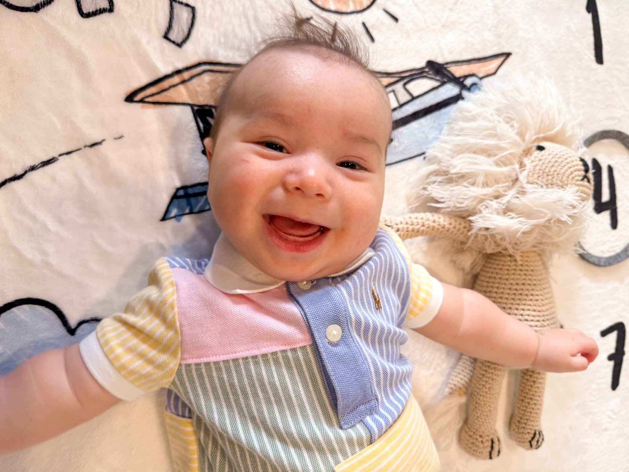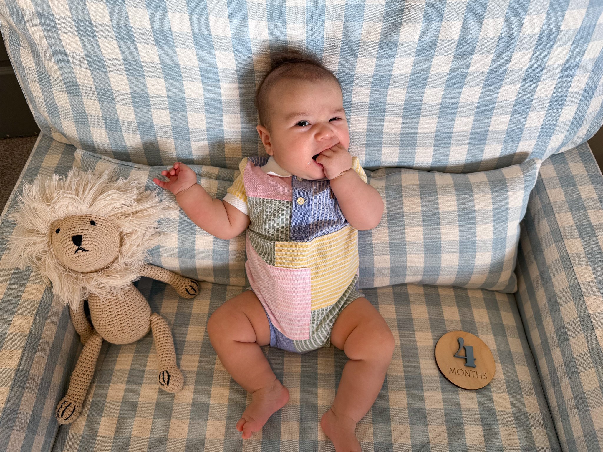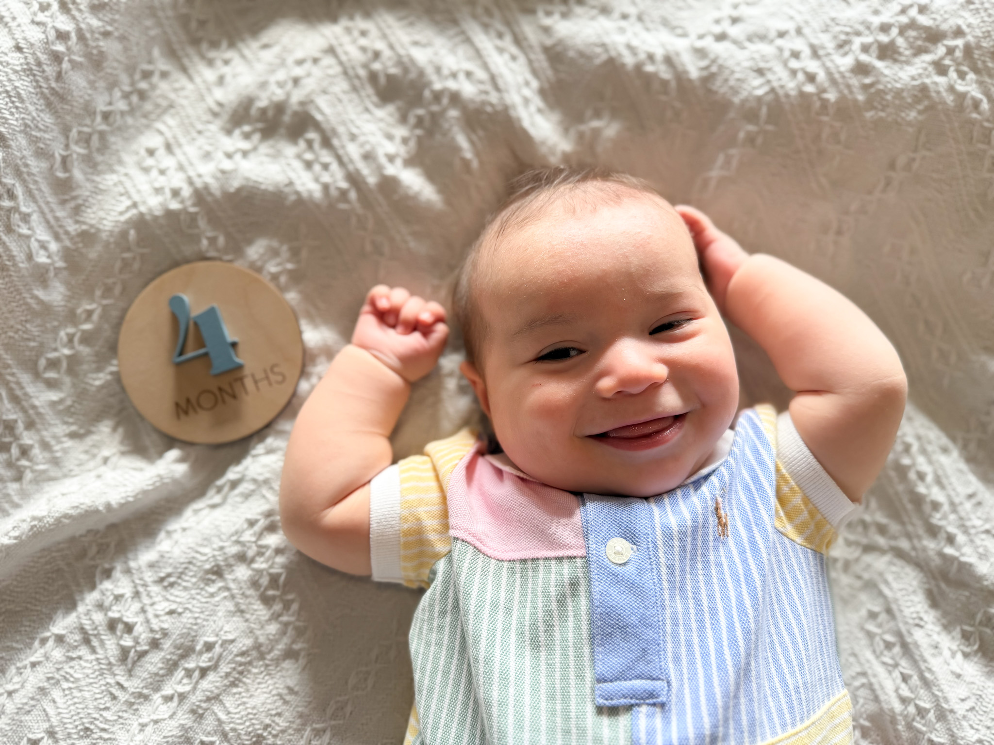 We had Maverik’s 4-month appointment, and he now weighs 15 lb 7.3 oz (47th percentile) and is 25 inches long (37th percentile). He is now double his birth weight, and those handmade rolls are so squishy and cute. I use his chunky rolls as emotional support and give them a good squish whenever I need it. He is smiley and super active—he cannot stay still! He constantly moves his arms and legs and wants to stand on his feet and tap dance all the time. The doctor said he’s hitting all the milestones he’s supposed to, which was great to hear. He received four vaccinations this visit—one oral and three shots in his legs. My poor baby screamed and cried, but he calmed down after chugging an entire 8-oz bottle of milk.
